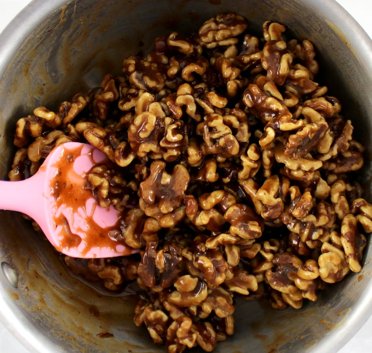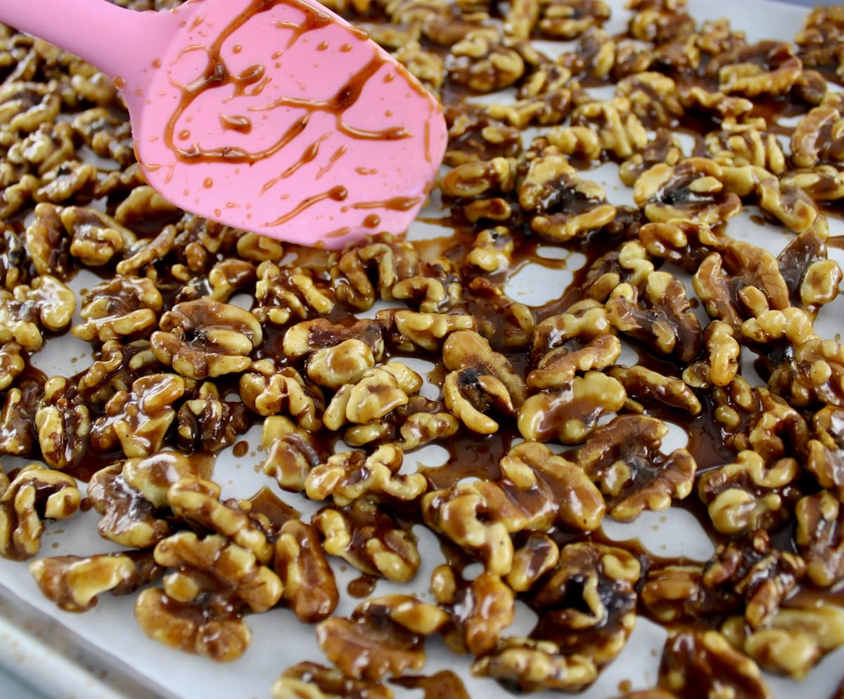 - Use a silicone spatula to quickly spread the coated walnuts before they cool.