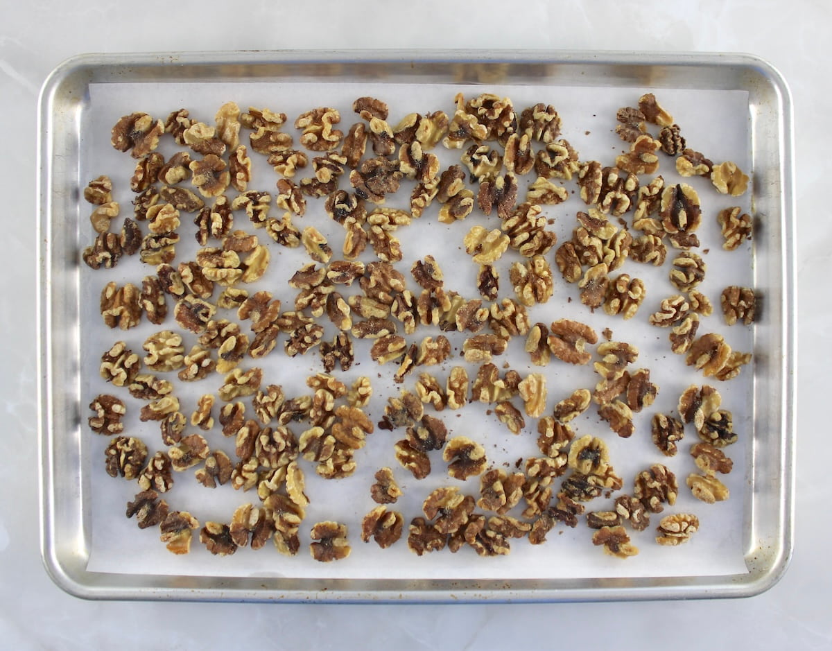- Spread out the walnuts on a baking sheet that’s been lined with parchment paper.
