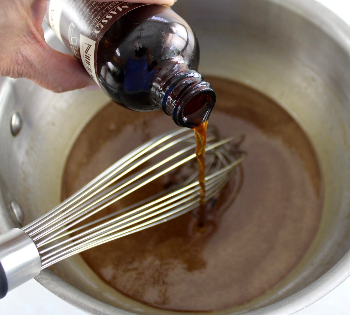 - Bring to a gentle simmer and stir until the sweetener has dissolved. Turn off the heat and whisk in the vanilla extract.