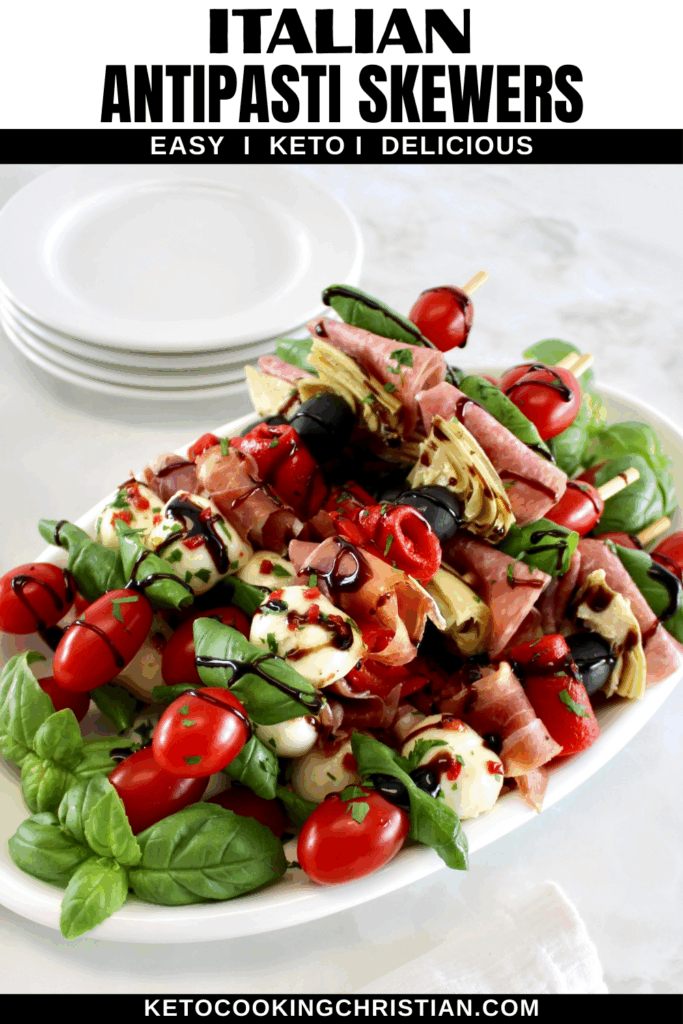 Serve these festive colorful Italian antipasti skewers at your next party and your guests will devour them! They make a great Low Carb snack and can even be made ahead of time!